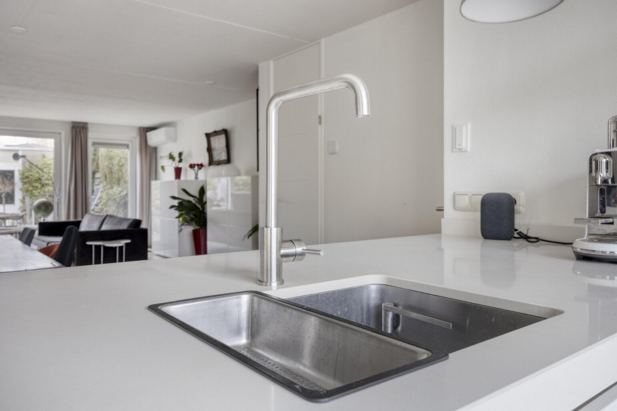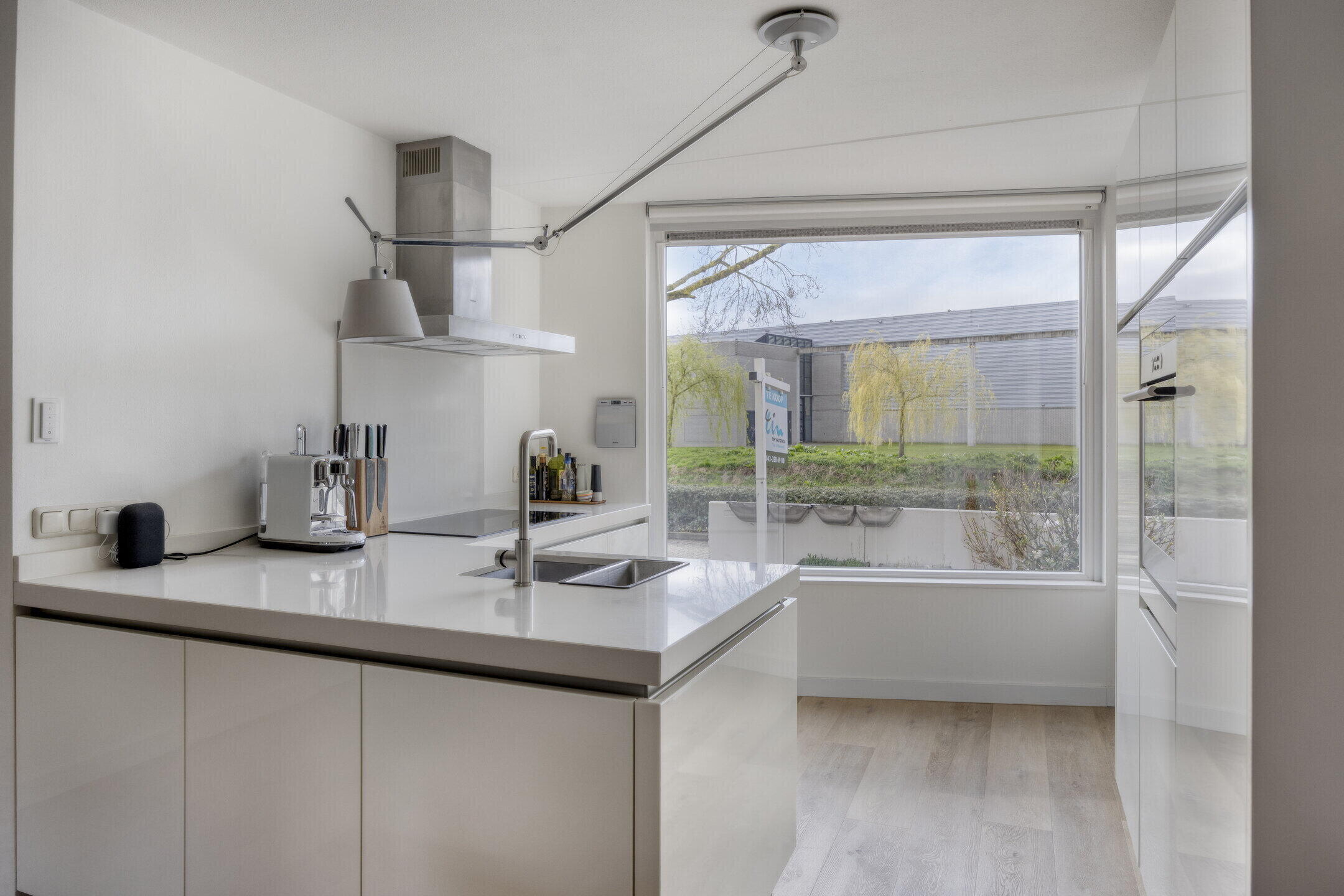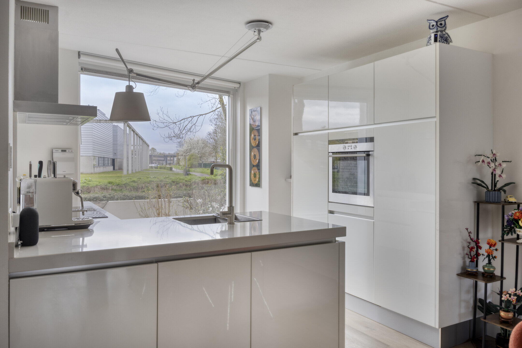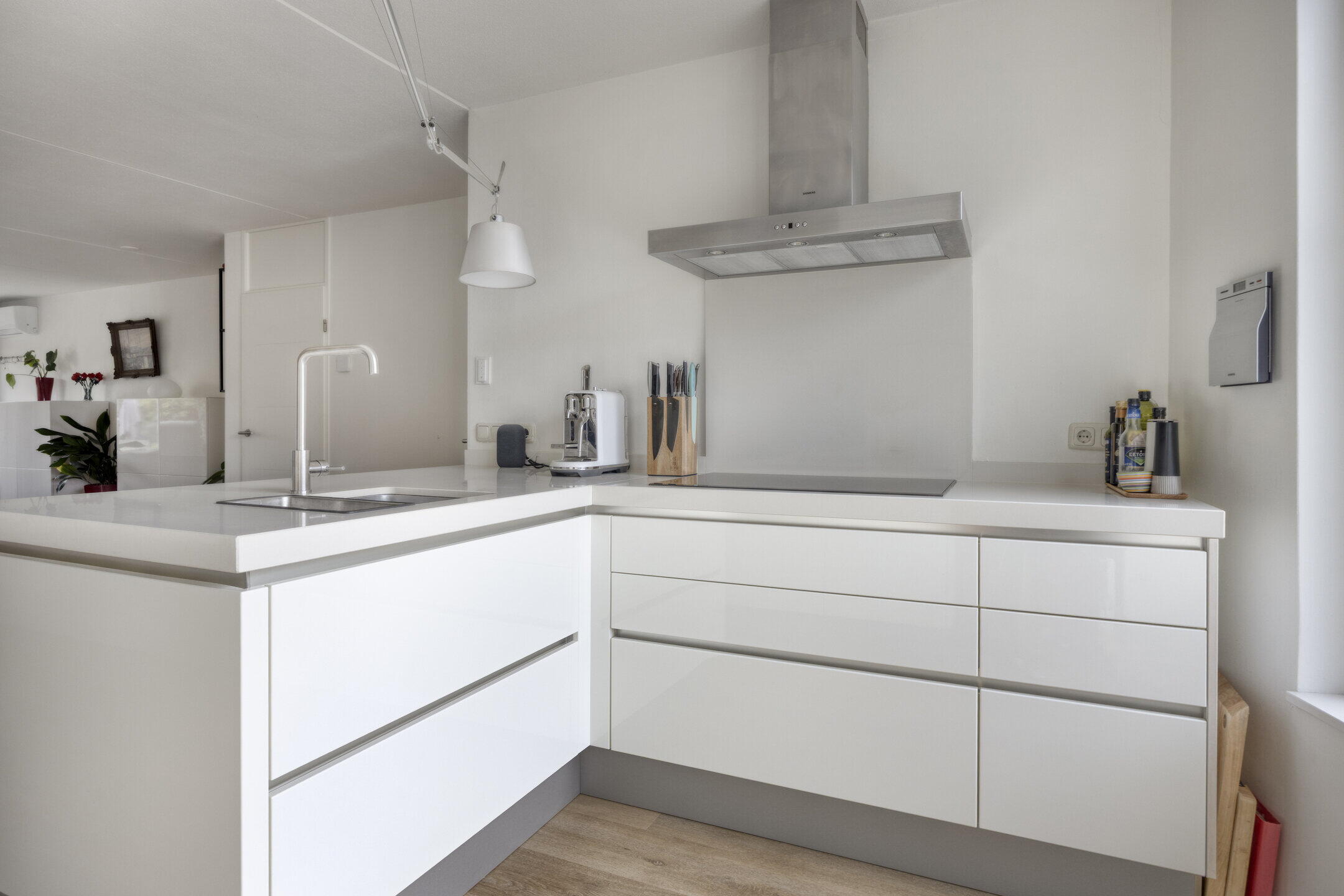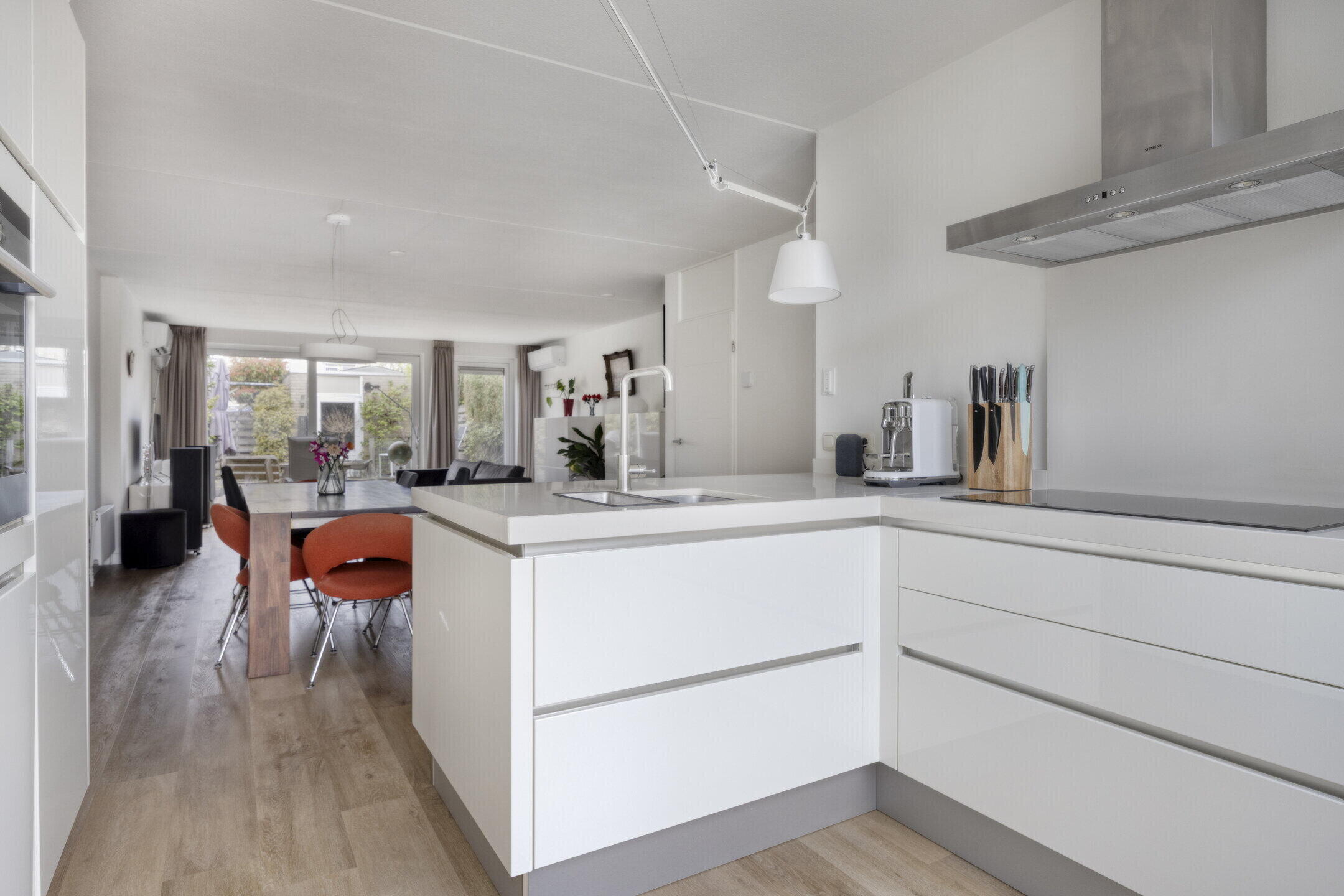 - Open keuken aan voorzijde (ca. 9 m²) voorzien van L-vormige moderne opstelling met aparte kastenwand v.v. composiet werkblad en achterwand, inductiekookplaat, RVS afzuigkap en wasbak, koelkast, vaatwasser, oven en witte kasten;