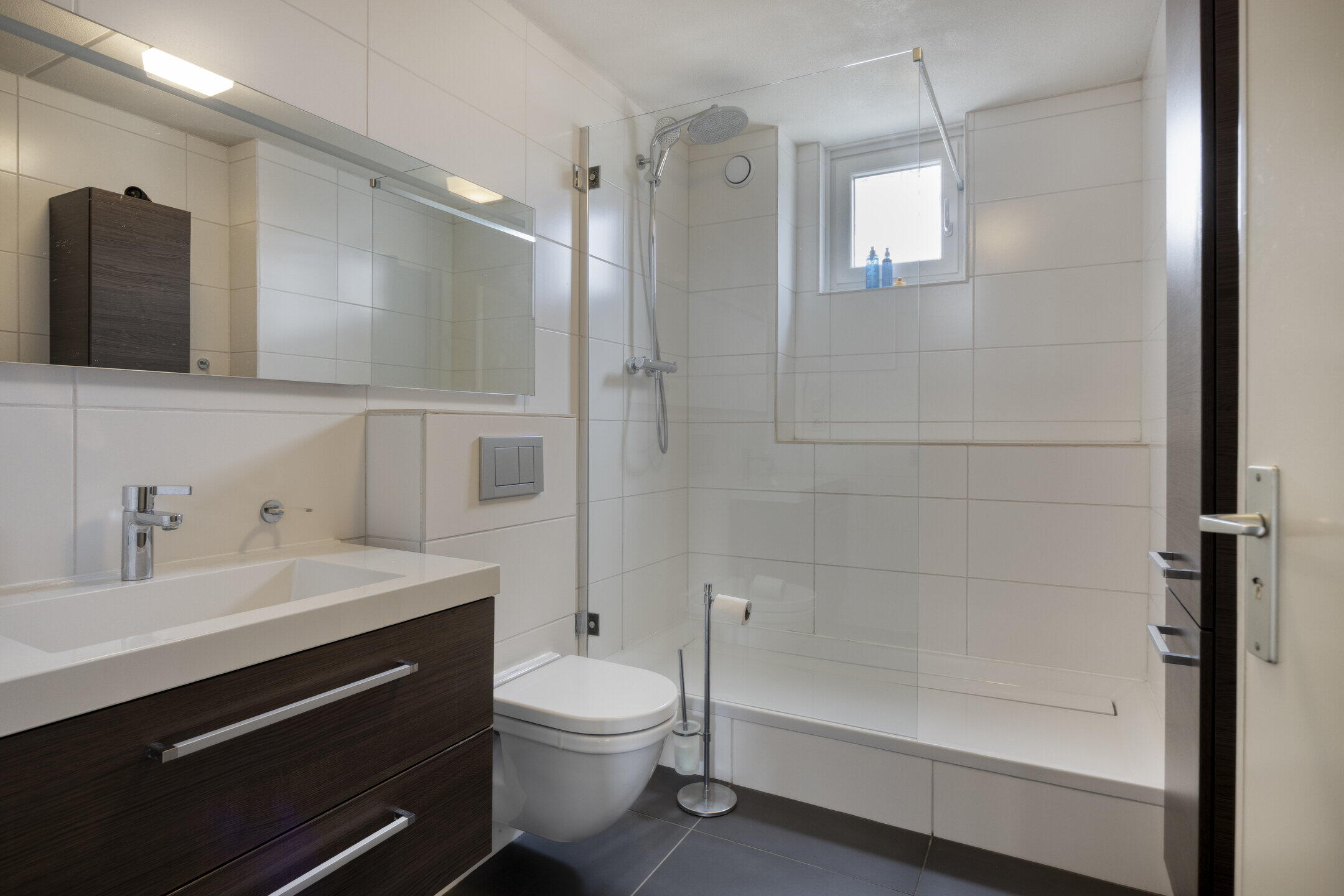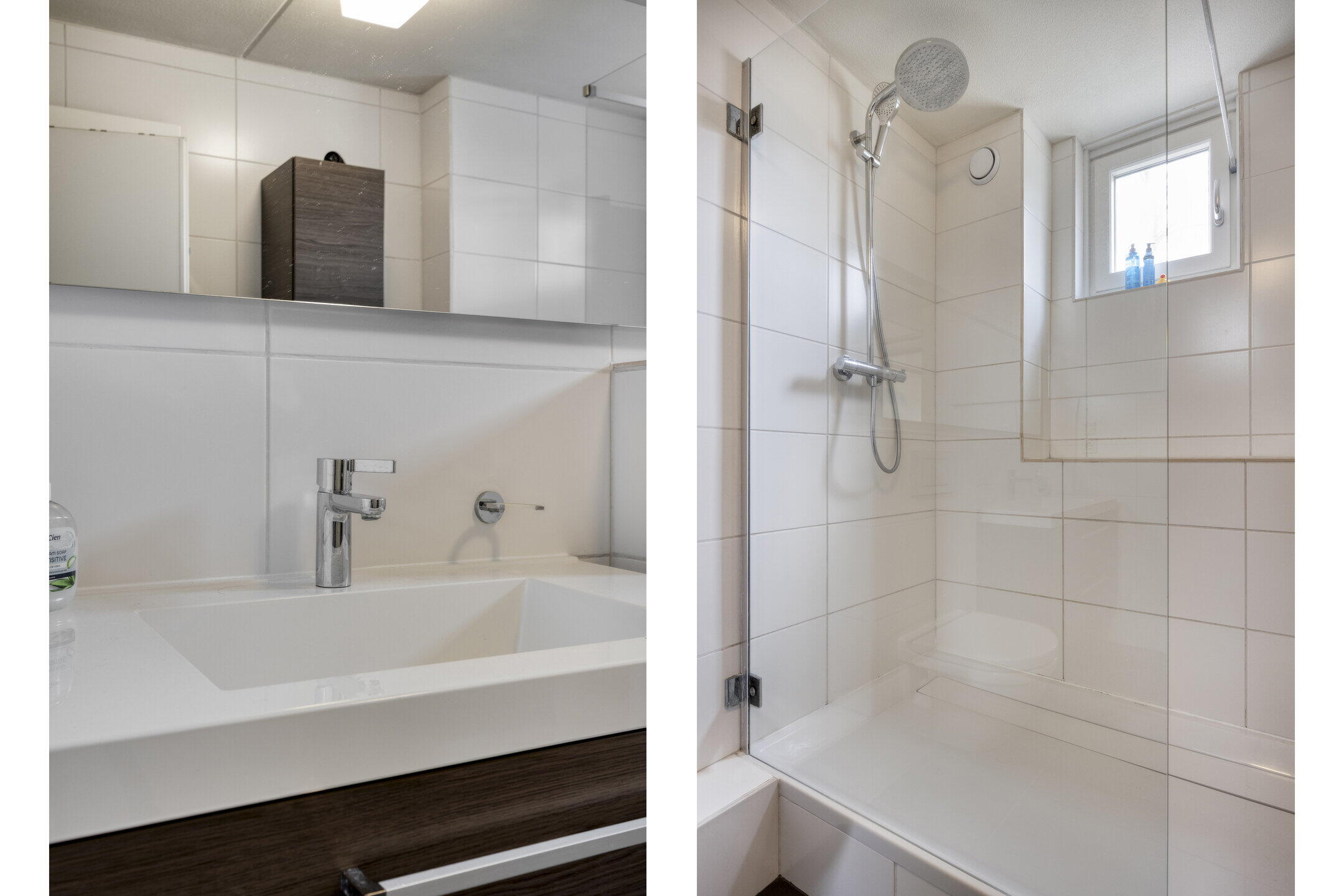 - Volledig betegelde badkamer (ca. 6 m²), v.v. douchecabine, 2e toilet en vaste wastafel met luxe wasmeubel.