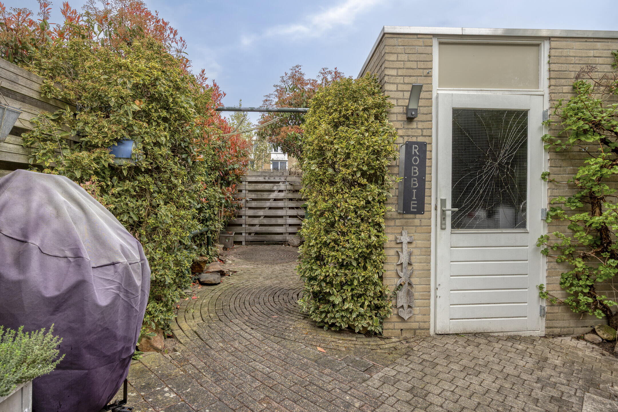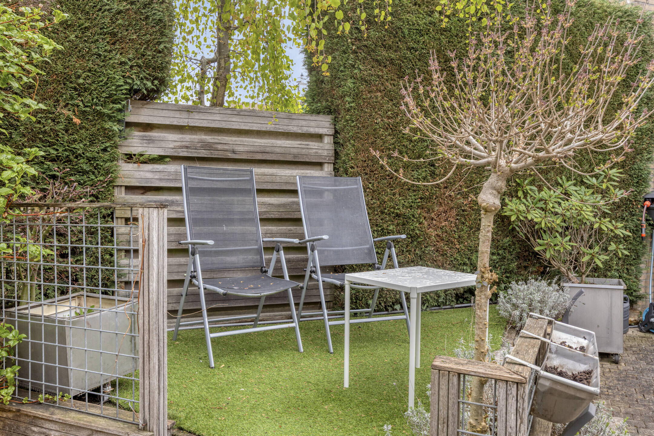- Comfortabele en goed onderhouden achtertuin op het noorden, met bestrating, gazon met kunstgras, borders, achterom en toegang tot de garage;
